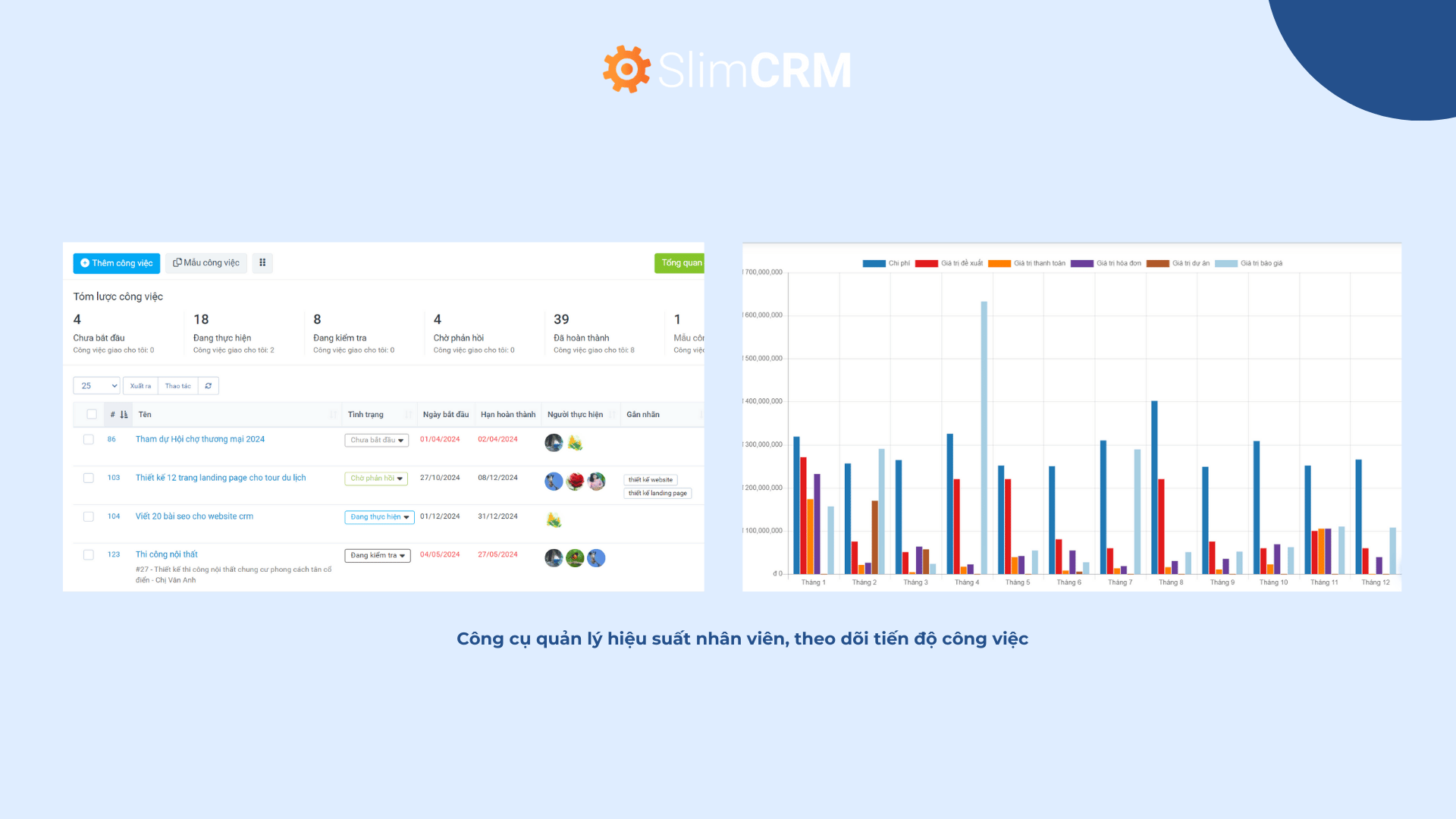 SlimCRM cung cấp công cụ quản lý hiệu suất nhân viên, theo dõi tiến độ công việc, báo cáo kết quả kinh doanh chi tiết. Từ đó giúp quản lý có thể đánh giá năng lực khách quan, tạo động lực làm việc cho nhân viên, tối ưu hóa hiệu quả hoạt động của phòng Sales.