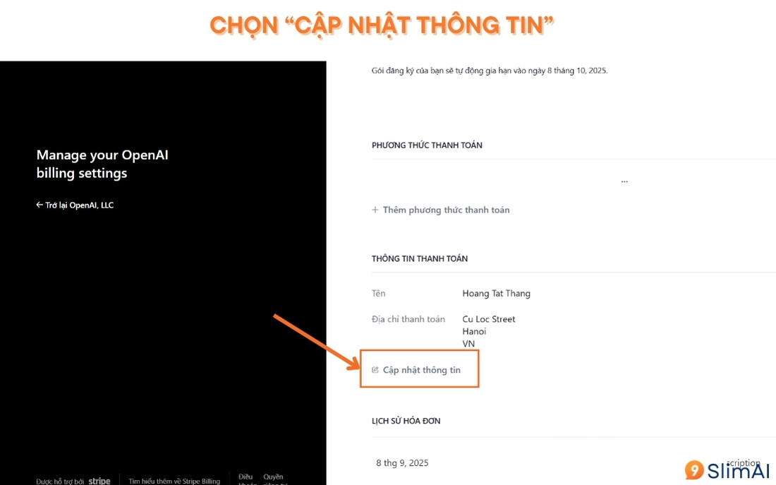 - Khi hệ thống chuyển hướng sang trang quản lý thanh toán, hãy chọn “Cập nhật thông tin” trong phần Thông tin thanh toán.