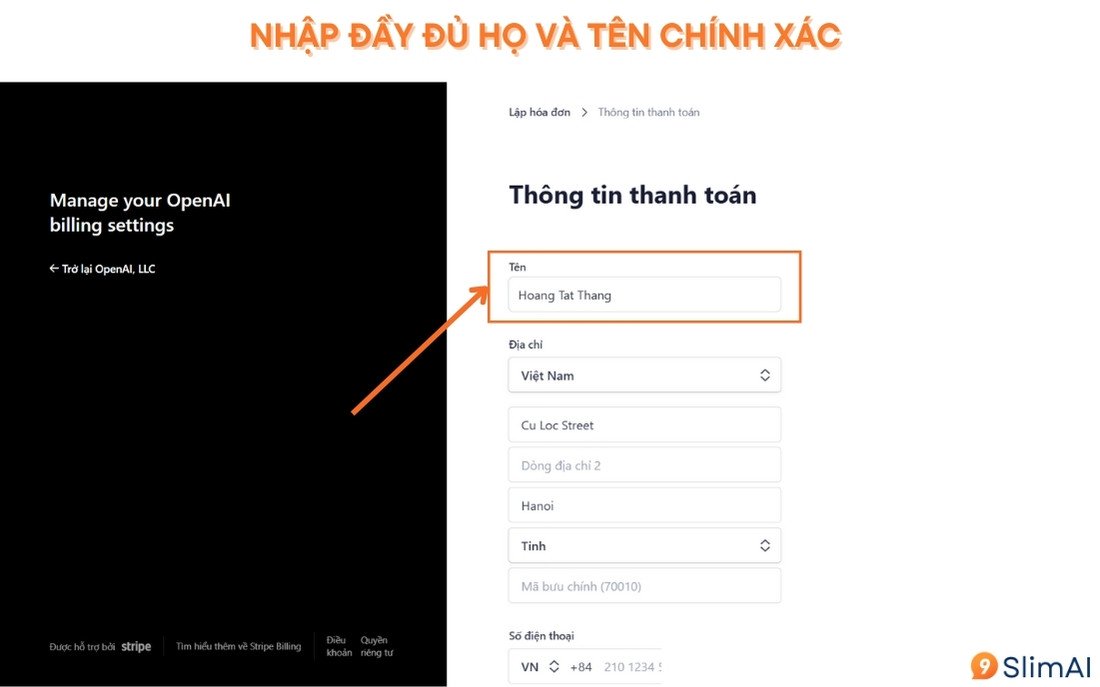 - Sau đó, hệ thống sẽ yêu cầu bạn nhập thông tin thanh toán. Lưu ý quan trọng: phần “Tên chủ thẻ” chính là thông tin sẽ được sử dụng để hiển thị tên bạn trong Hồ sơ người xây dựng khi xuất bản GPT trên GPT Store – hãy đảm bảo điền chính xác và đầy đủ.