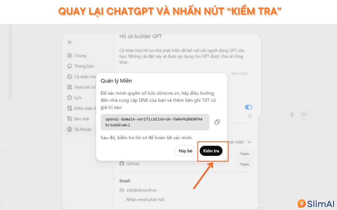 Sau khi lưu bản ghi TXT, quay lại ChatGPT và nhấn nút “Kiểm tra”. Nếu mọi thứ được cấu hình chính xác, bạn sẽ nhận được thông báo xác nhận rằng tên miền đã được xác minh thành công.
