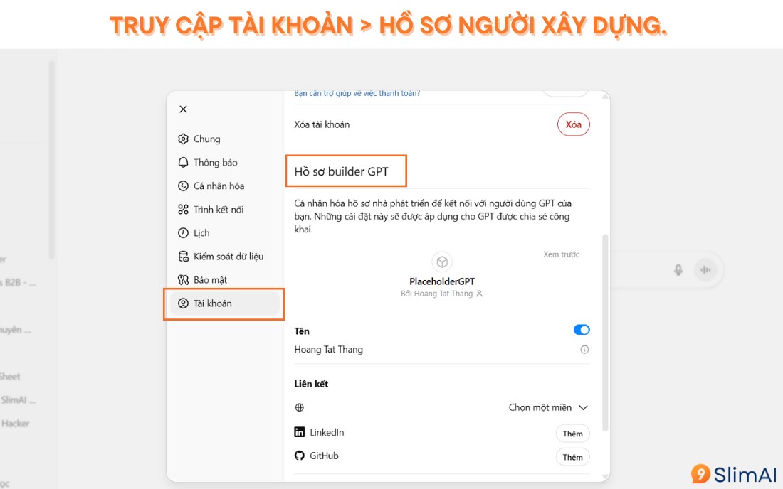 - Truy cập Tài khoản > Hồ sơ Builder GPT..