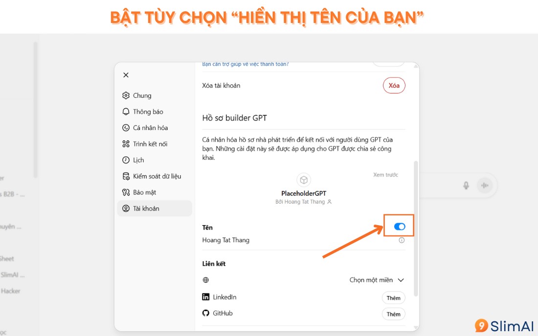 - Bật tùy chọn “Hiển thị tên của bạn” nếu bạn muốn tên cá nhân xuất hiện công khai cùng với GPT trên GPT Store.
