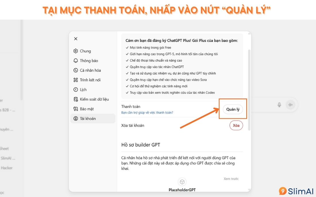 - Trước tiên, truy cập Cài đặt > Tài khoản trong ChatGPT. Tại mục Thanh toán, nhấp vào nút “Quản lý”.