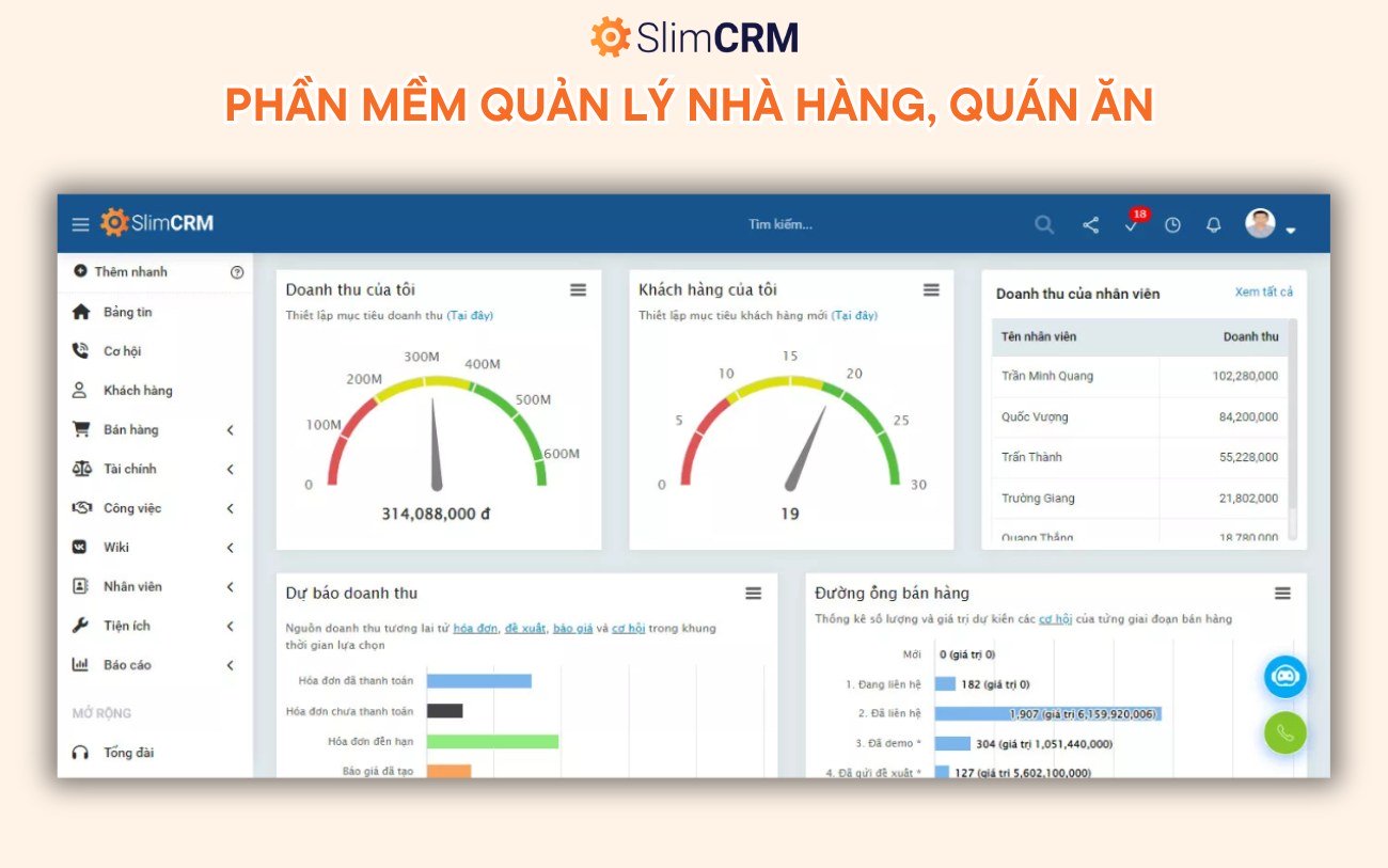 - Phần mềm quản lý nhà hàng, quán ăn: Phần mềm giúp theo dõi tình hình tài chính, nhân lực mọi lúc mọi nơi. Bạn có thể dùng thử phần mềm SlimCRM với mức giá chỉ khoảng 800.000đ/ tháng.