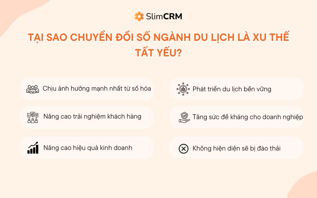 Tại cấp độ doanh nghiệp, nhiều công ty lữ hành, cơ sở lưu trú và đơn vị cung cấp dịch vụ đang chủ động chuyển đổi số thông qua phần mềm quản lý doanh nghiệp như SlimCRM. Với khả năng quản lý khách hàng, quản lý tour, điều hành tour, xử lý booking và tự động hóa chăm sóc sau bán, SlimCRM đã giúp nhiều doanh nghiệp nhỏ và vừa trong ngành du lịch nâng cao hiệu suất làm việc mà không cần đầu tư quá lớn vào hạ tầng công nghệ.