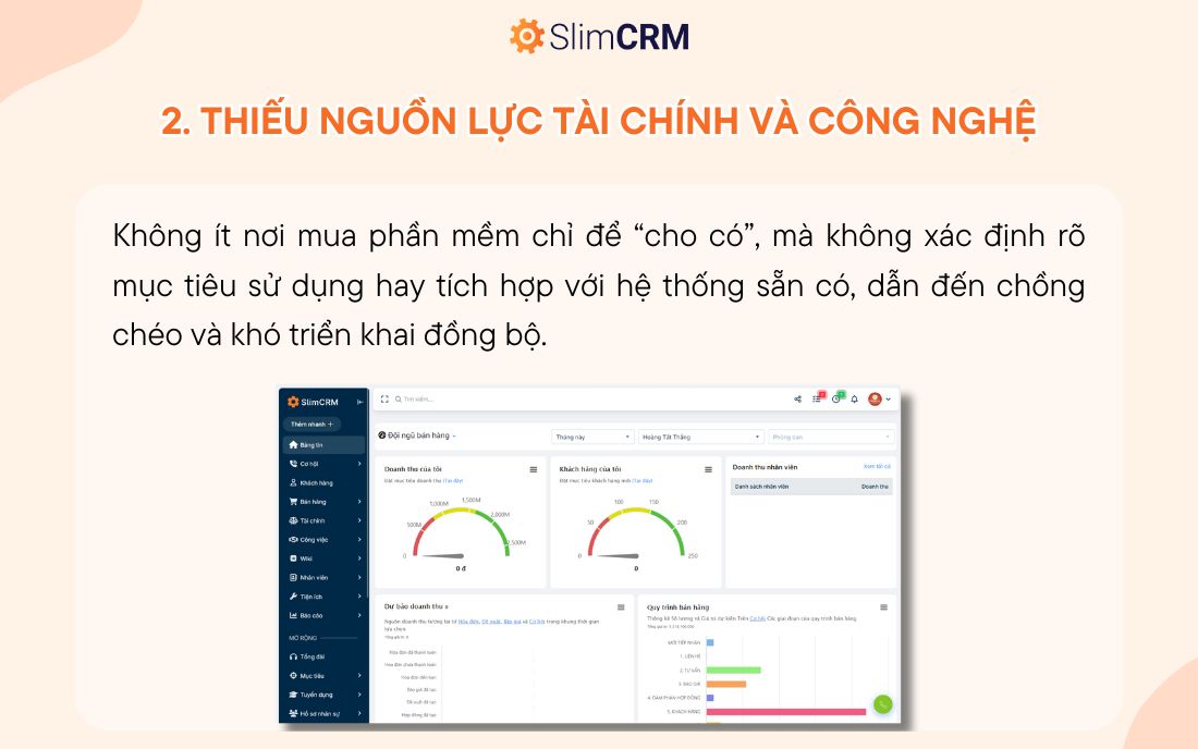 Một trong những lý do khiến doanh nghiệp “ngại” chuyển đổi số là sợ không biết dùng phần mềm, hoặc sợ phức tạp. SlimCRM hiểu điều đó và luôn đồng hành cùng khách hàng từ A–Z. Hệ thống cung cấp hướng dẫn chi tiết theo ngành, giao diện tiếng Việt dễ dùng, đội ngũ hỗ trợ luôn sẵn sàng tư vấn qua điện thoại, Zalo, email.