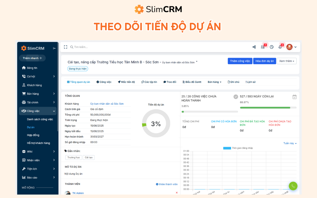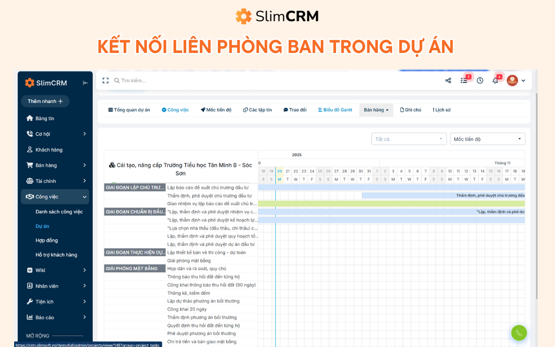 Ví dụ: SlimCRM với tính năng phân quyền linh hoạt và báo cáo theo dự án có thể triển khai để quản lý hợp đồng giữa văn phòng và các đội thi công, từ đó tạo luồng xử lý nhanh gọn và minh bạch