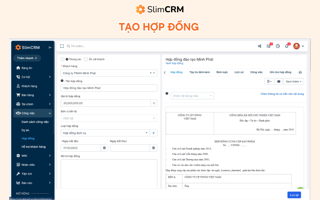 SlimCRM là một nền tảng quản trị đa năng cho doanh nghiệp vừa và nhỏ, trong đó module quản lý hợp đồng được tích hợp chặt chẽ với các phân hệ như: CRM, công việc, dự án, tài liệu. Dưới đây là các tính năng nổi bật của SlimCRM: