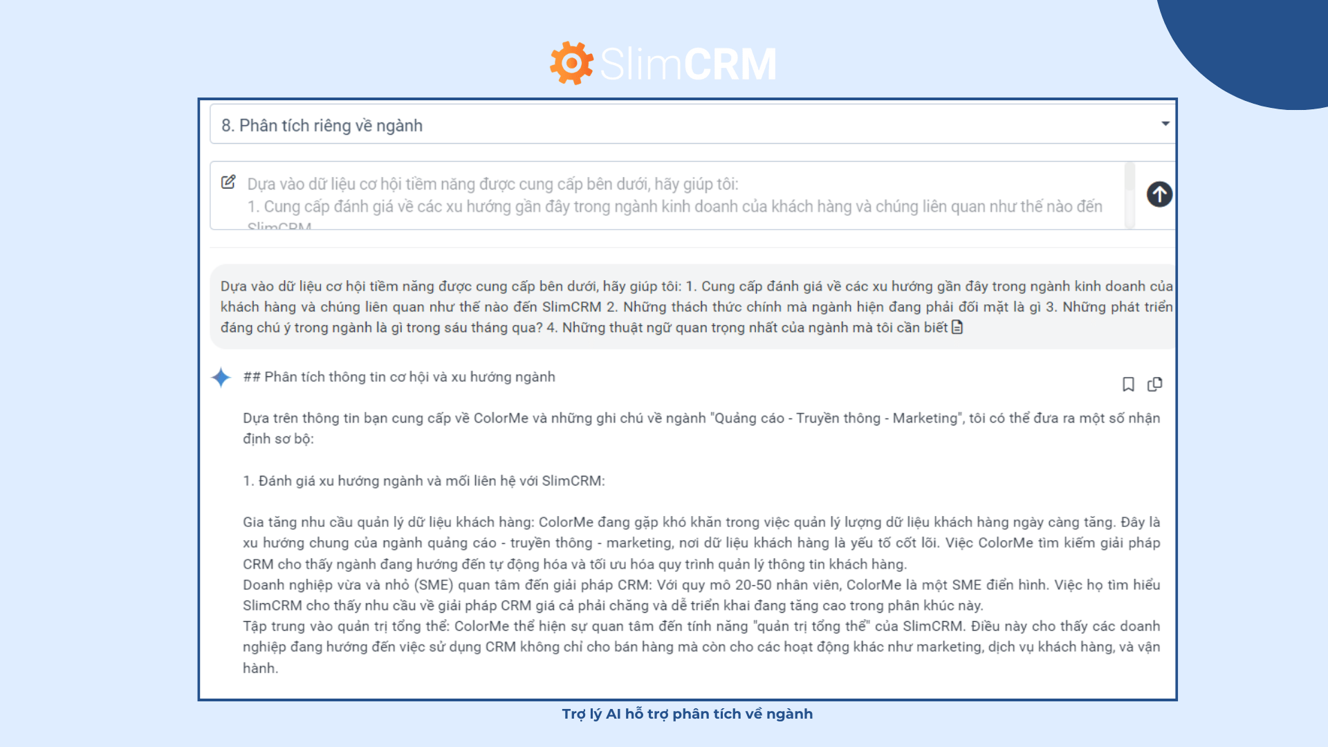 Với Trợ lý AI của SlimCRM, bạn có thể nhận được bản phân tích nỗi đau của khách hàng, của doanh nghiệp và toàn ngành, các kịch bản tiếp cận khách hàng đều được cá nhân hóa theo nguồn dữ liệu chi tiết đã được thu thập và lưu trữ.